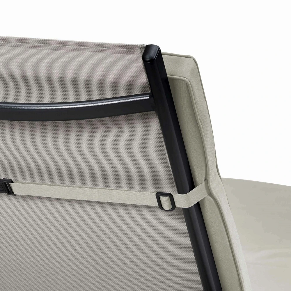 grâce à la sangle, il suffit de glisser le coussin sur le bain de soleil / transat / chaise longue, puis de le fixer avec les 2 liens latéraux.