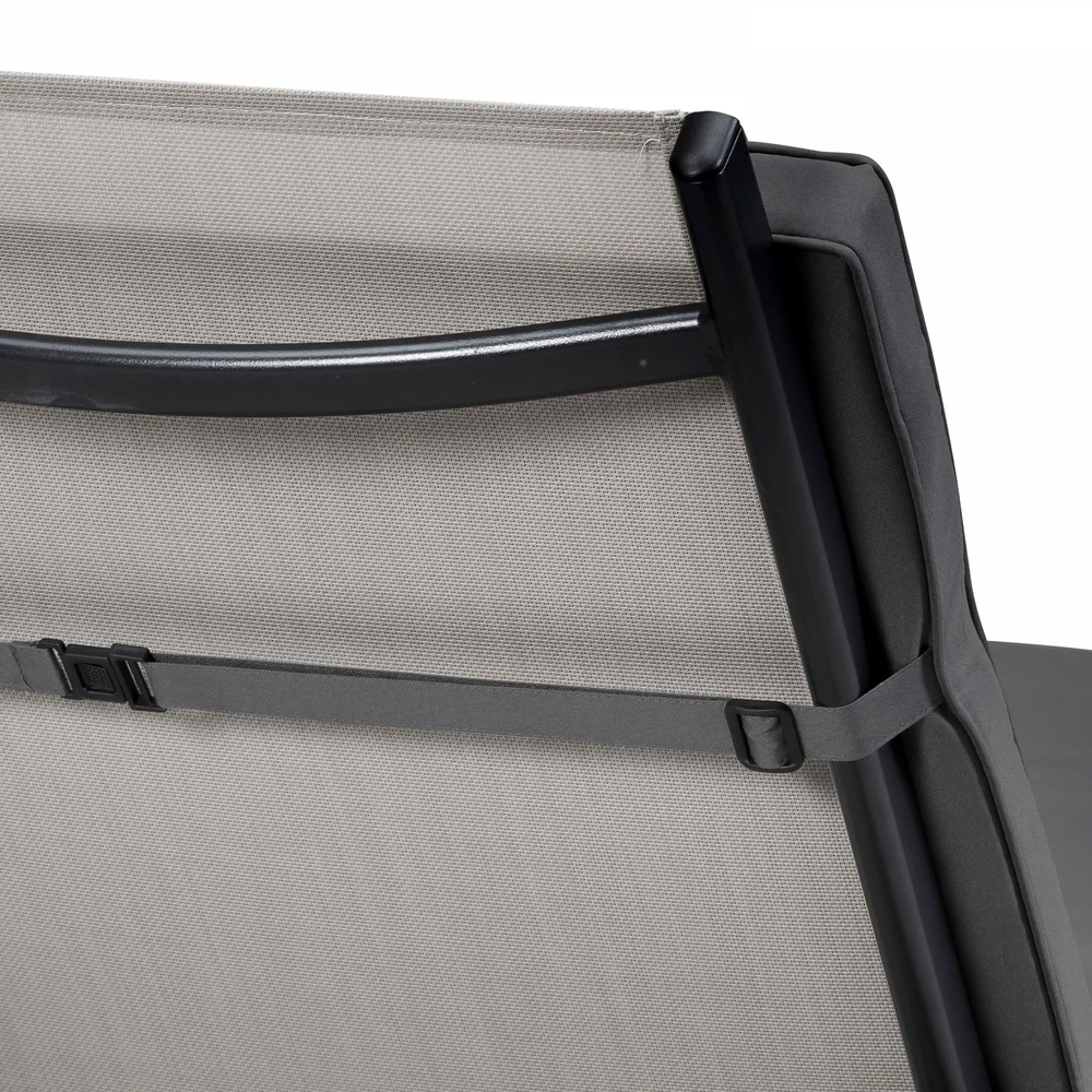 grâce à la sangle, il suffit de glisser le coussin sur le bain de soleil / transat / chaise longue, puis de le fixer avec les 2 liens latéraux.