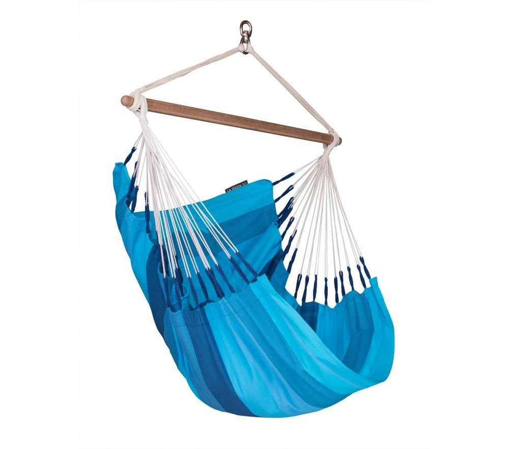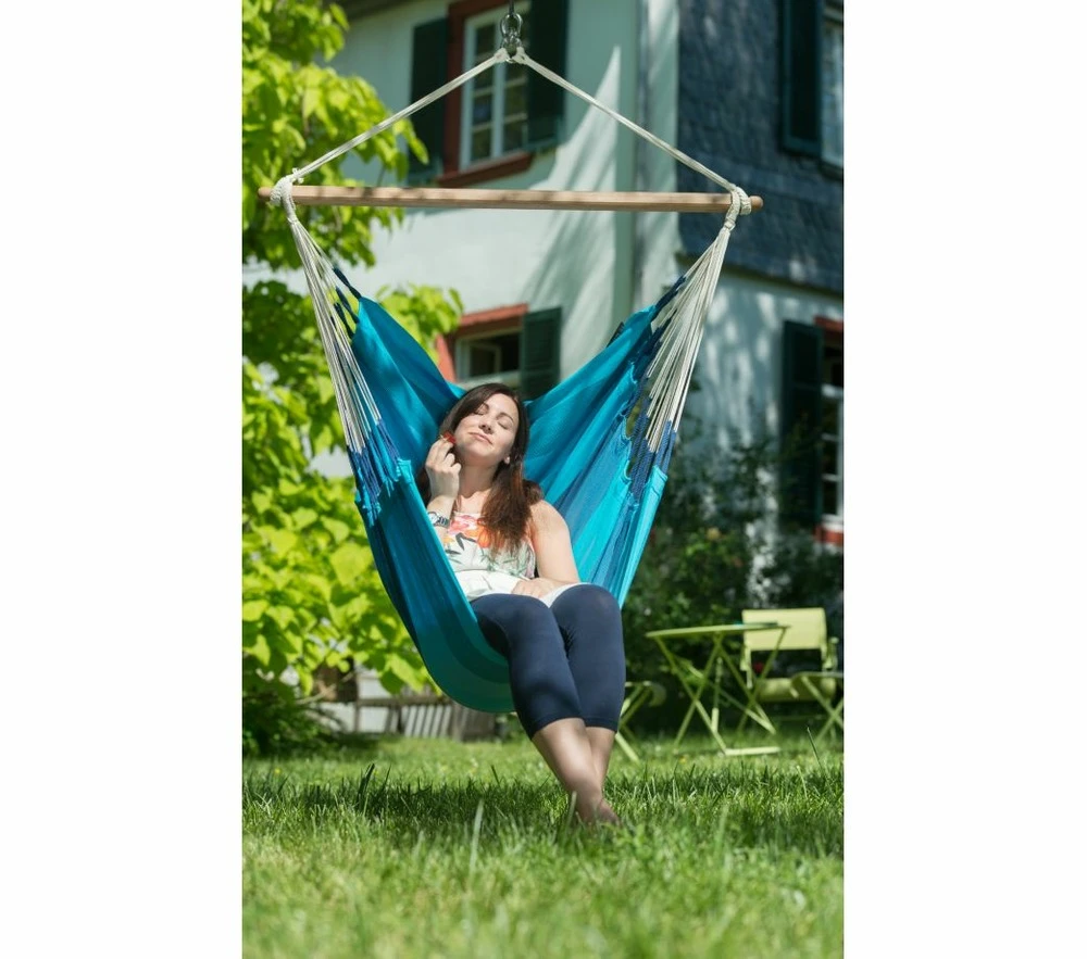 la chaise-hamac orquidea basic lagoon, frais et bleu comme l’océan est un vrai oasis, rempli de bonne humeur, pour accrocher dans la maison.