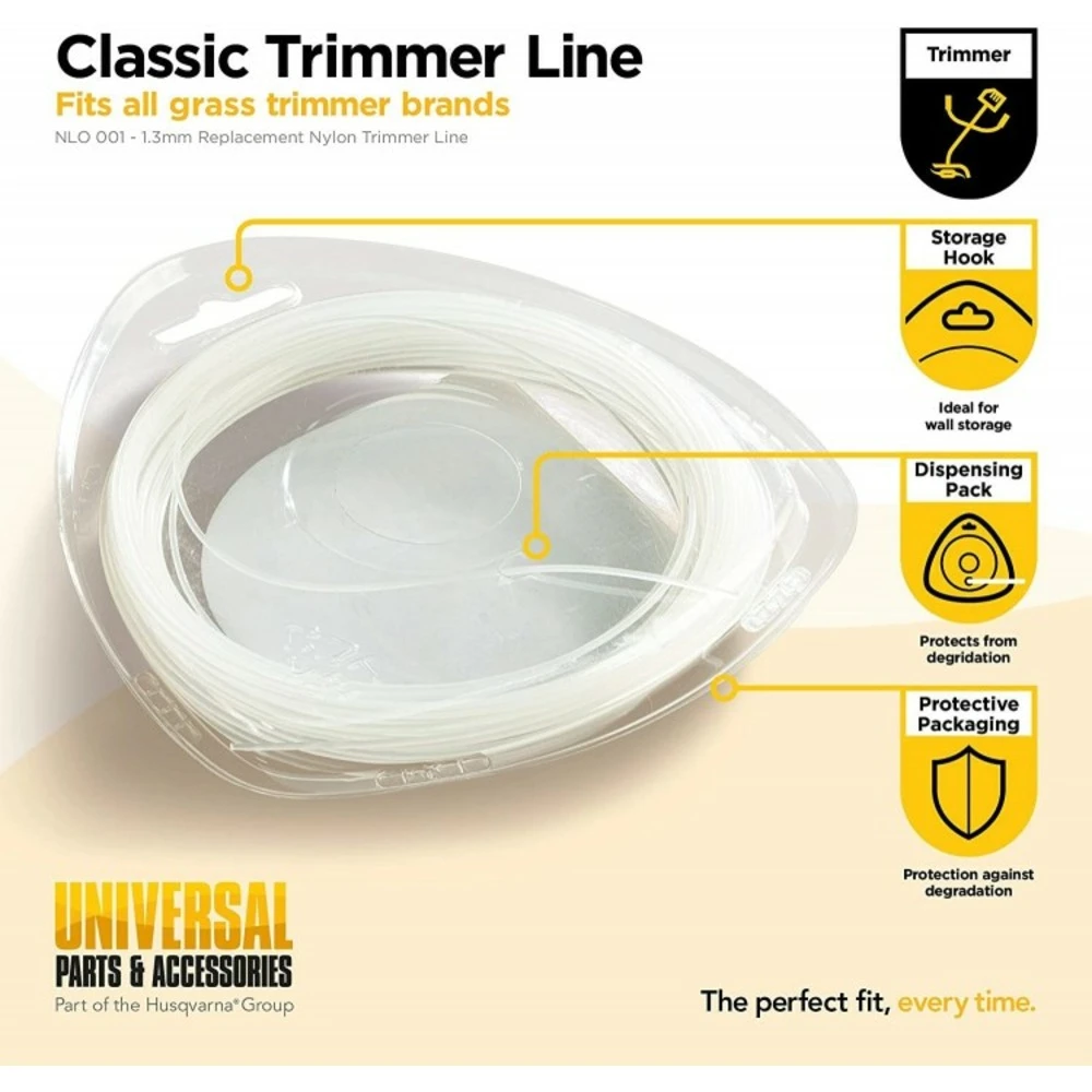 Ligne de coupe universal – accessoire d’origine de qualité mcculloch éprouvée : le fil de nylon universal est idéal pour tailler le gazon et les broussailles en toute tranquillité. Grâce à une technologie brevetée, les pousses, les chardons et même l’herbe dure sont coupés proprement et, surtout, sans bruit. Le fil de coupe est en nylon résistant et durable.fil nylon rond 1,3 mm x 15 m de la marque universalqualité mcculloch : la ligne de fauchage coupe l’herbe et les broussailles avec une précision maximale et assure une coupe nettedurabilité : le fil en nylon est résistant à la déchirure et peut être utilisé pendant longtempsfil de coupe de haute qualité : le fil a une longueur de 15 m