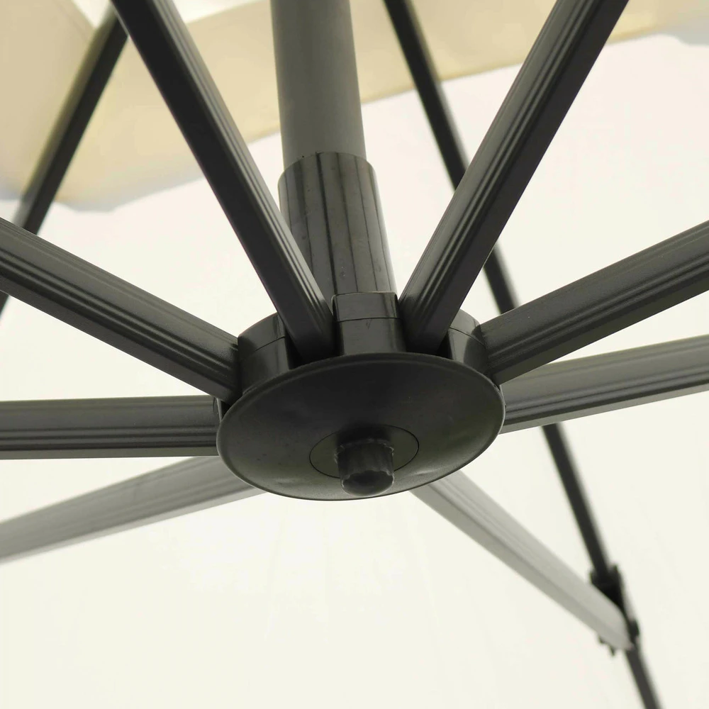 parasol déporté carré esthétique 3 x 3 m, et 2 m 50 de hauteur, procure une large surface de 9 m² d’ombrage, idéal pour terrasse et jardin. Ce parasol excentré est très solide grâce à son mât principal de 77 mm x 53 mm de diamètre et son mât déporté 26 mm x 45 mm maintenu par 8 baleines. Ce parasol de jardin et de terrasse est très résistant grâce à sa structure 100 % en aluminium et sa toile 100 % polyester 250 g/m². Cette toile de parasol dispose d’un traitement anti uv, est déperlante et teintée dans la masse pour éviter toute décoloration.