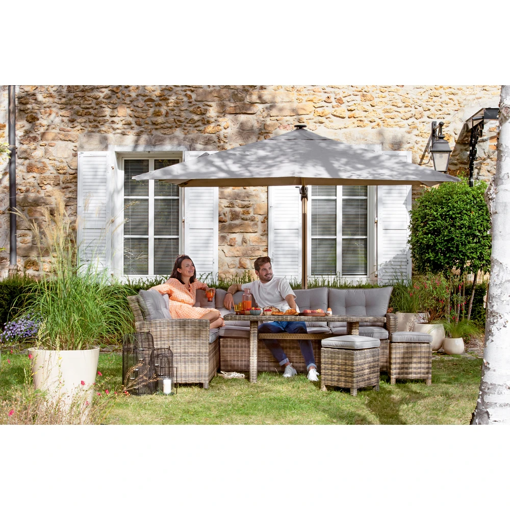 Avec le retour des beaux jours, vous allez enfin pouvoir prolonger vos soirées au jardin ou en terrasse en profitant de votre salon de jardin avec vos proches. Le salon de jardin d’angle de la ligne HESTIA a été conçu afin de s’intégrer naturellement à vos extérieurs. Il séduit par son design classique et intemporel. Facile d’entretien, il est compact pour maximiser l’utilisation de vos espaces de vie et répondra idéalement aux aspirations d’une famille nombreuse. Votre salon de jardin d’angle HESTIA est composé d’un grand canapé d’angle (260 x 204 x 83 cm), de 2 tabourets (38 x 38 x 39 cm) et d’une 1 table (85 x 150 x 65 cm). Très robustes, les éléments du salon de jardin HESTIA en aluminium, résine tressée et verre concernant le plateau de sa table vous permettront de profiter de votre salon de nombreuses années. L’aluminium est un métal inoxydable, très léger, durable et 100% recyclable. La résine tressée quant à elle est imputrescible, résistante à l’eau, aux rayons UV et donc à la décoloration liée à l’ensoleillement. Le plateau en verre de 5 mm d’épaisseur de la table HELIOS est imprimé en bénéficiant d’une superbe finition texturée. De son côté, l’aluminium traité Epoxy composant les éléments de votre salon leur permettra de résister aux diverses conditions météorologiques impactant nos extérieurs. Votre salon HESTIA est vendu avec ses coussins Spunpolyester 200 grammes. 100% en polyester, ils sont résistants aux intempéries et aux UV. Très confortables, vous apprécierez la densité de leur assise offrant un maintien très moelleux (Densité de l’assise : 28 kg/m² – Garnissage : 260 gr/m²). Votre salon de jardin HESTIA donnera à votre espace de détente privilégié un charme unique que votre déco d’extérieur soit moderne ou authentique. Salon de jardin d’angle ligne HESTIA en aluminium & tressage 4 pièces.