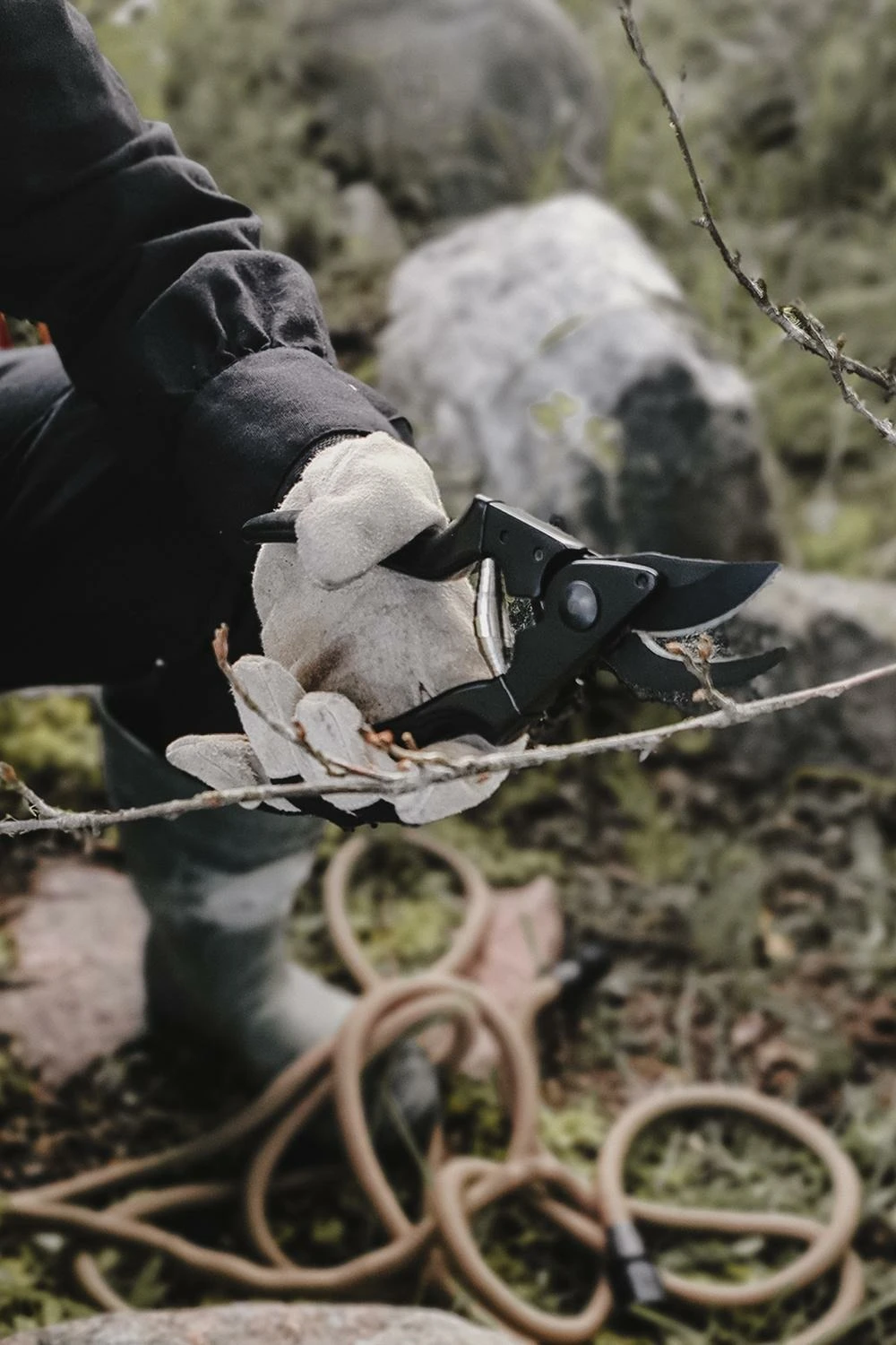 Enfin un sécateur vraiment élégant, et en même temps fonctionnel, de la plus haute qualité. Les poignées sont en aluminium pressé dur avec du plastique tout autour pour augmenter la résistance tout en minimisant le poids. Absorption des chocs intégrée. Coupe latérale. Coupe les branches jusqu’à 25 mm.