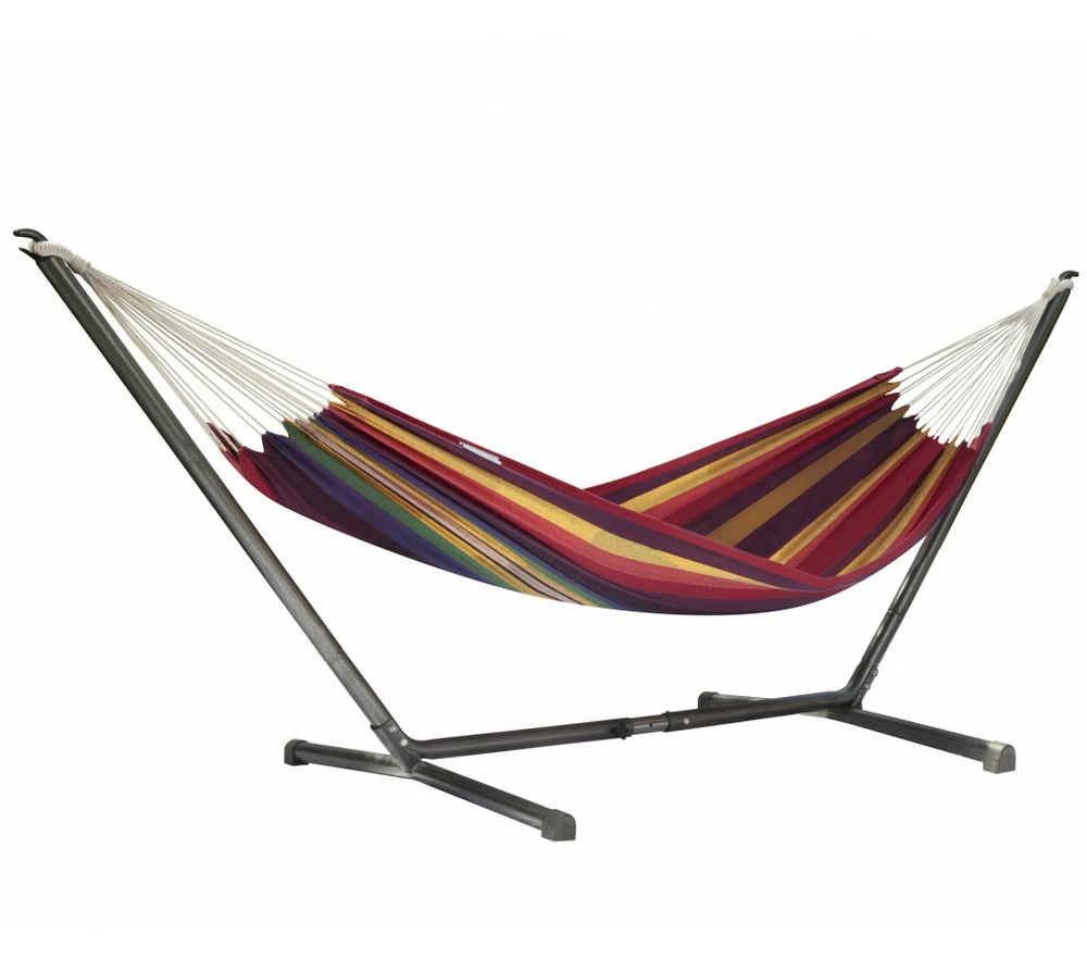 le hamac simple classique associé à son support métal au meilleur rapport qualité prix. Rien n’est sacrifié au prix : ce hamac est de bonne facture, livré avec une housse de rangement dans le même tissus et un support à la finition robuste.