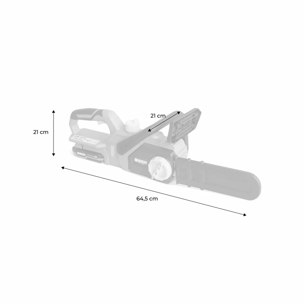 dimensions : l64.5xp21xh21cmmoteur : 20v, brushrotations à vide du moteur : 19000tr/mnvitesse chaine : 5m/spoids avec batterie : 3.2kgslongueur de coupe : 25cmdiamètre de coupe : section de 25cm maxchaîne et guide : 10″ (30,5cm), chaîne : 91p040x – guide : 100sdea041lubrification : automatique (huile de tronçonneuse non fournie), réservoir 120ml.batterie : lithium-ion sunpower 20v, 2000mah (40wh), avec jauge led, compatible outils 20vchargeur : ~200-240v/50-60 hz, 20v, 900 ma (25w), témoin led de chargeautonomie : environ 30mn à plein régimetemps de charge : 1 à 2.5 heures (selon chargeur) / 2.5 heures avec chargeur fournitriple sécurité : frein de chaine, bouton à enclencher + gâchette de démarrage.chassis : en polypropylène injecté thermomoulécache inclusindice de protection : ipx0classe de protection : iii